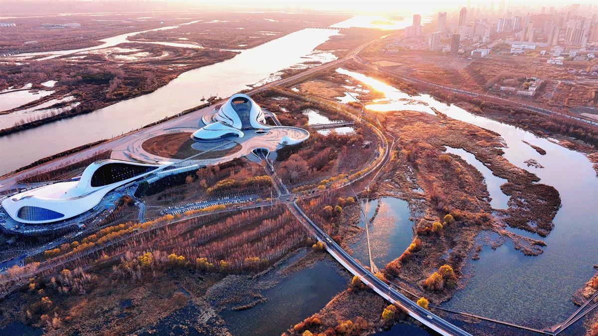 哈尔滨文化中心位于松花江北岸的湿地之中,在合理保护与利用生态湿地的基础上,让哈尔滨大剧院、职工文化艺术宫、万人广场和原生态湿地景观公园共同构成一个“文化岛”,实现人文、艺术与自然的融合。