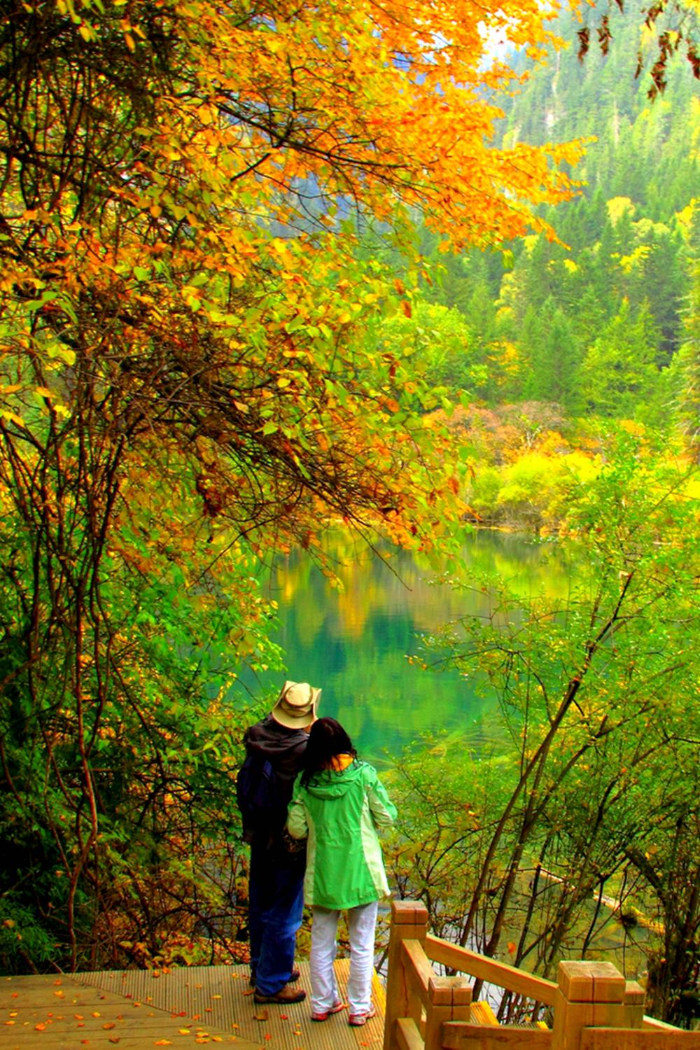10月的九寨沟,秋意正浓,五彩斑斓的树木与清澈的湖水相映成趣。一对夫妻相依欣赏着美丽的画卷......