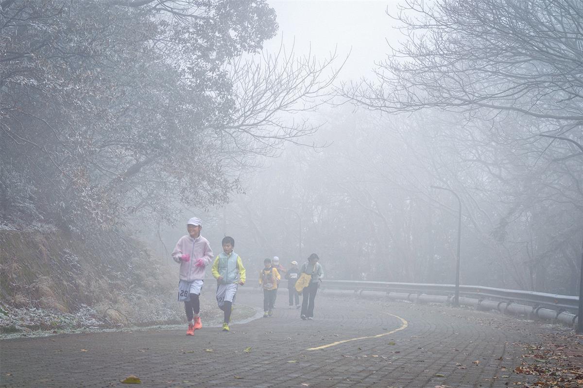 在雪雾弥漫的冬日山径,薄霜覆满林梢,湿冷的雾气将天地晕染成一片柔和的灰白。画面中,领跑女孩的笑容穿透薄雾,鲜亮的粉色外套在朦胧背景中格外醒目;身后的伙伴们踩着湿润的铺砖路向前奔跑,跃动的身影在清冷的自然环境里,碰撞出滚烫的生命力。捕捉到的这一瞬间,它不仅定格了山野赛事的鲜活瞬间,更通过 “严寒” 与 “活力” 的视觉反差,传递出少年无畏严寒、舒展生长的蓬勃朝气,诠说了拼搏与热爱的力量。