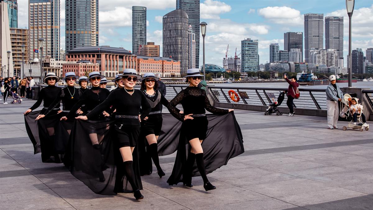 银发阿姨们在黄浦江边尽情起舞,黑裙旋起时尚风,为外滩注入生活新意,尽显不服岁月的活力。