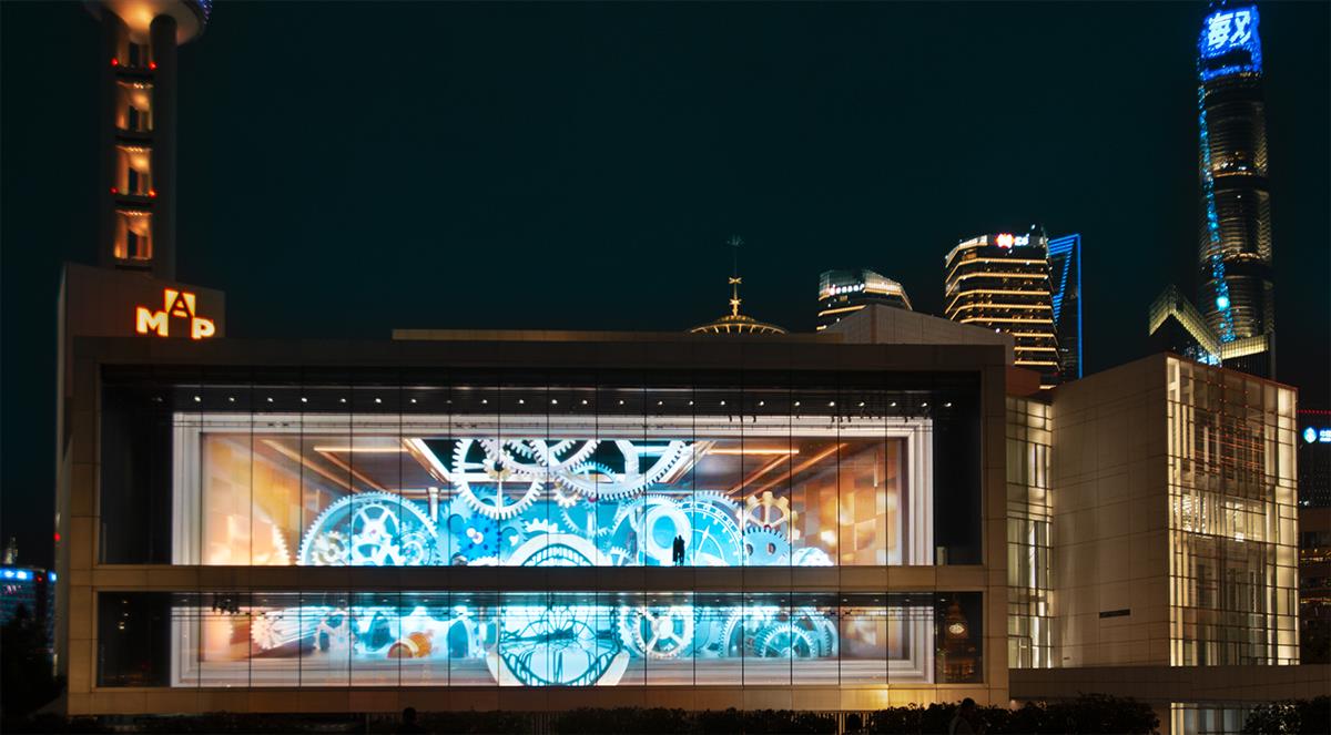 摄于上海浦东美术馆。美术馆展示厅播放着城市宣传片