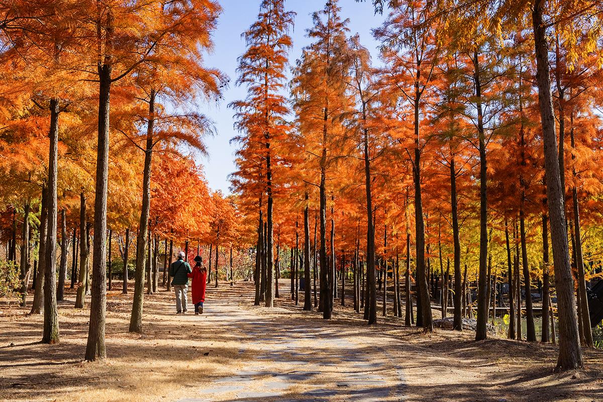 秋日里,水杉林染上橙红,阳光铺在林间小路上,两人漫步其中,影子被拉得悠长,嗳色调的树叶和蓝天相映,满是宁静又温柔的秋意。
