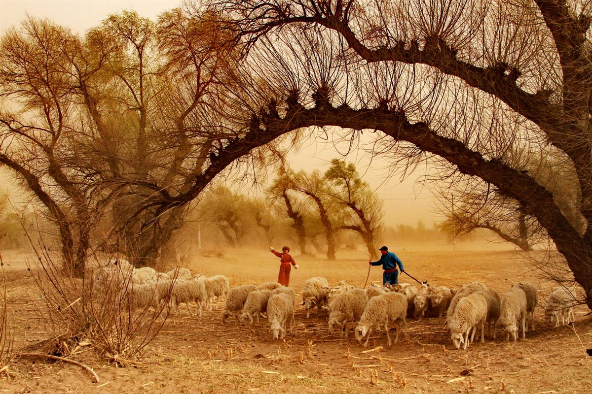 怪树林位于奈曼旗中东部,这里有一株株、一片片奇形怪状的柳树,真是天造地设、鬼斧神工、形态怪异的沙漠怪柳。只要展开你的想象就能将你眼前的怪柳的形象对上号。当时正值八级大风,一对男女牧羊人,赶着一群羊在怪树林中向我们走来。风沙四起,油画般的画面展现在我们眼前,我们连连按下快门,将这难得美景收入镜中。