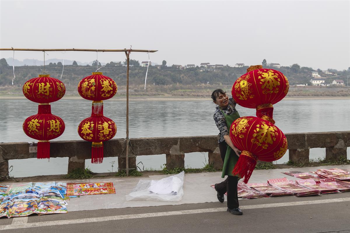 春节前的集市灯笼是应节商品,散场时档主把灯笼收进仓库。
