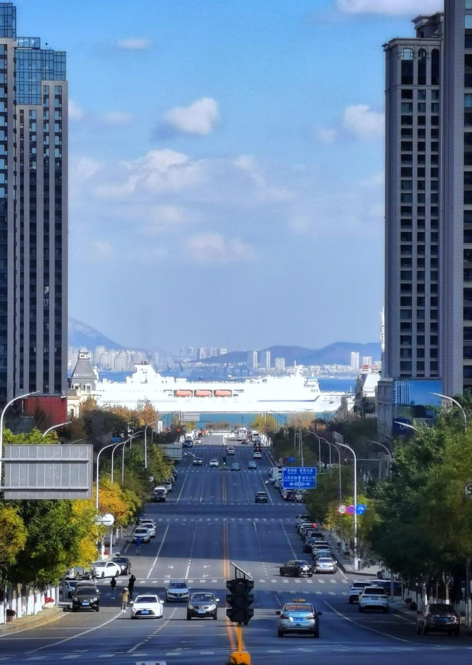 这是拍于大连港东五街上的一个看大船穿楼而过画面。