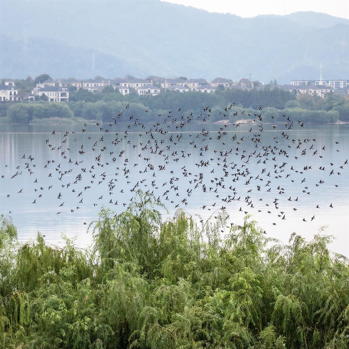 随着生态环境的改善,青山湖引来100多种飞禽在栖息和繁殖后代。图为在青山湖畔拍摄到的一群丝光椋鸟。