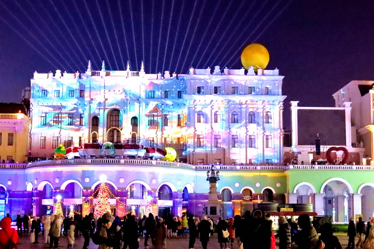 哈尔滨市索菲亚广场上演灯光秀,让游客在光影流转中邂逅哈尔滨的浪漫与活力。