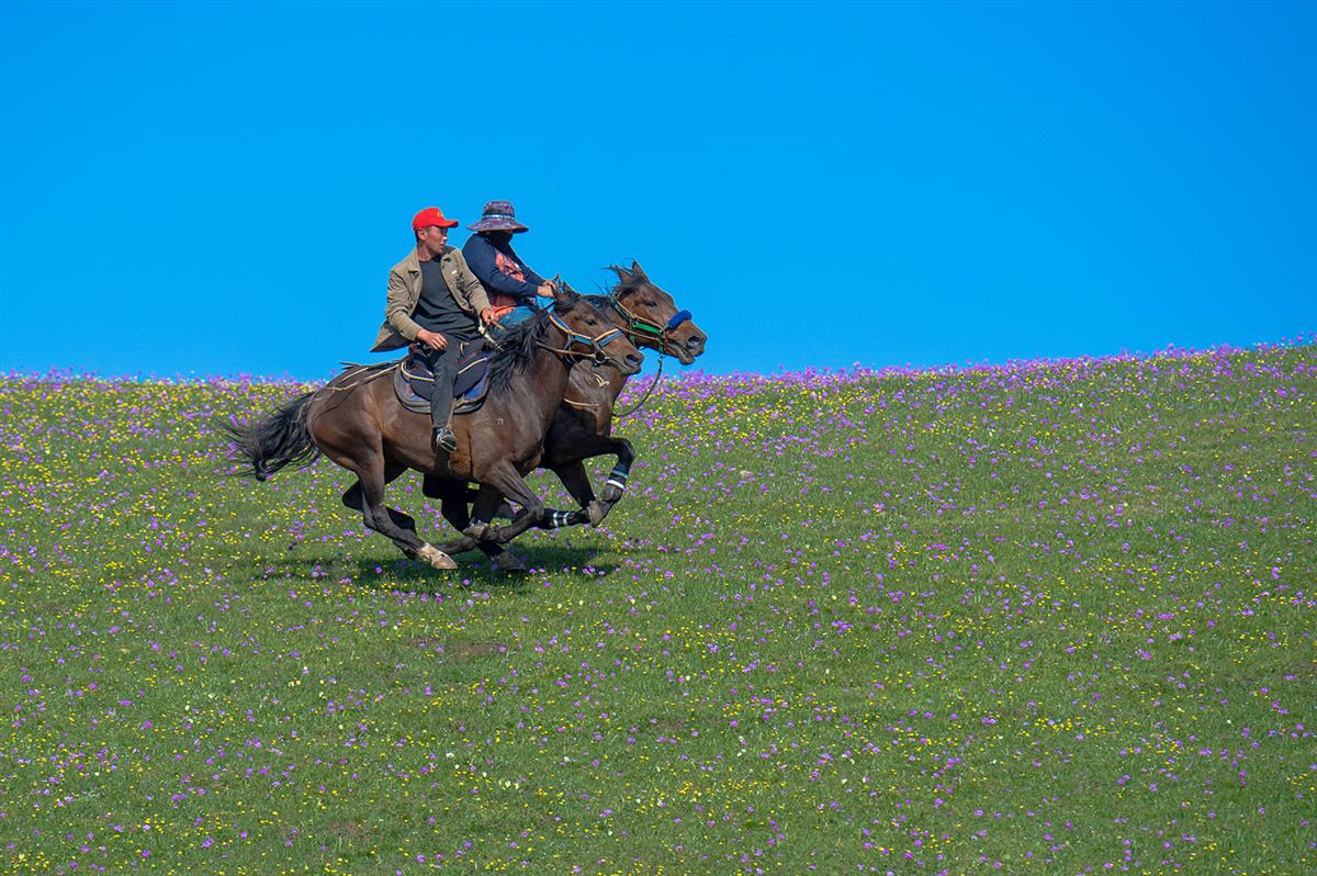 牧民骑着马在开满鲜花的草原奔驰,马蹄缭绕着花的香气。