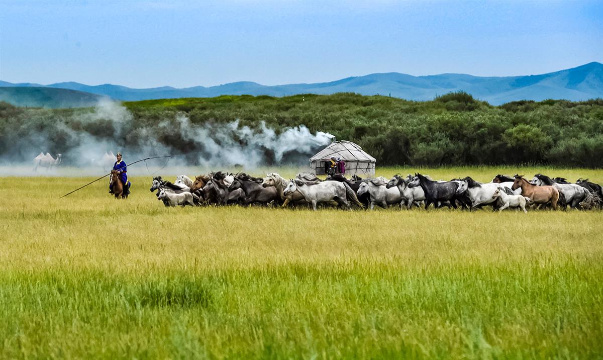 锡林郭勒大草原养育了蒙古族牧民,草原就是他们的家,黄昏,蒙古包上飘动着炊烟,牧马人赶着马群奔驰在草原上,画面呈现着草原人家的烟火气。