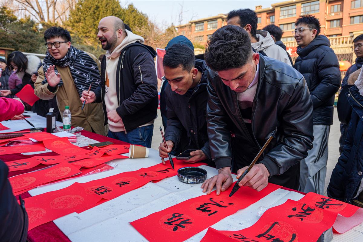 2026年1月23日,腊八节。山东省泰安市岱岳区天平湖社区里,红幅铺展,外国友人手持毛笔,在宣纸上认真书写新春祝福。这一刻,墨香跨越了语言的隔阂,腊八的暖意不仅在粥里,更在这充满魅力的文化共鸣之中。