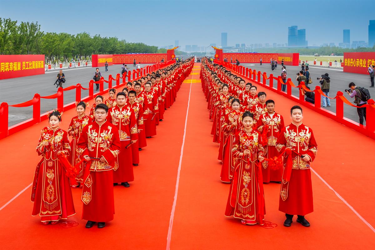 在2025年520(我爱你)这一天,安徽省合肥市骆岗公园的红色长毯上,302对新人身着中式礼服,整齐列队,大红的裙摆与喜庆的红毯交相辉映,场面庄重而热烈,洋溢着传统中式婚礼的浪漫与仪式感。