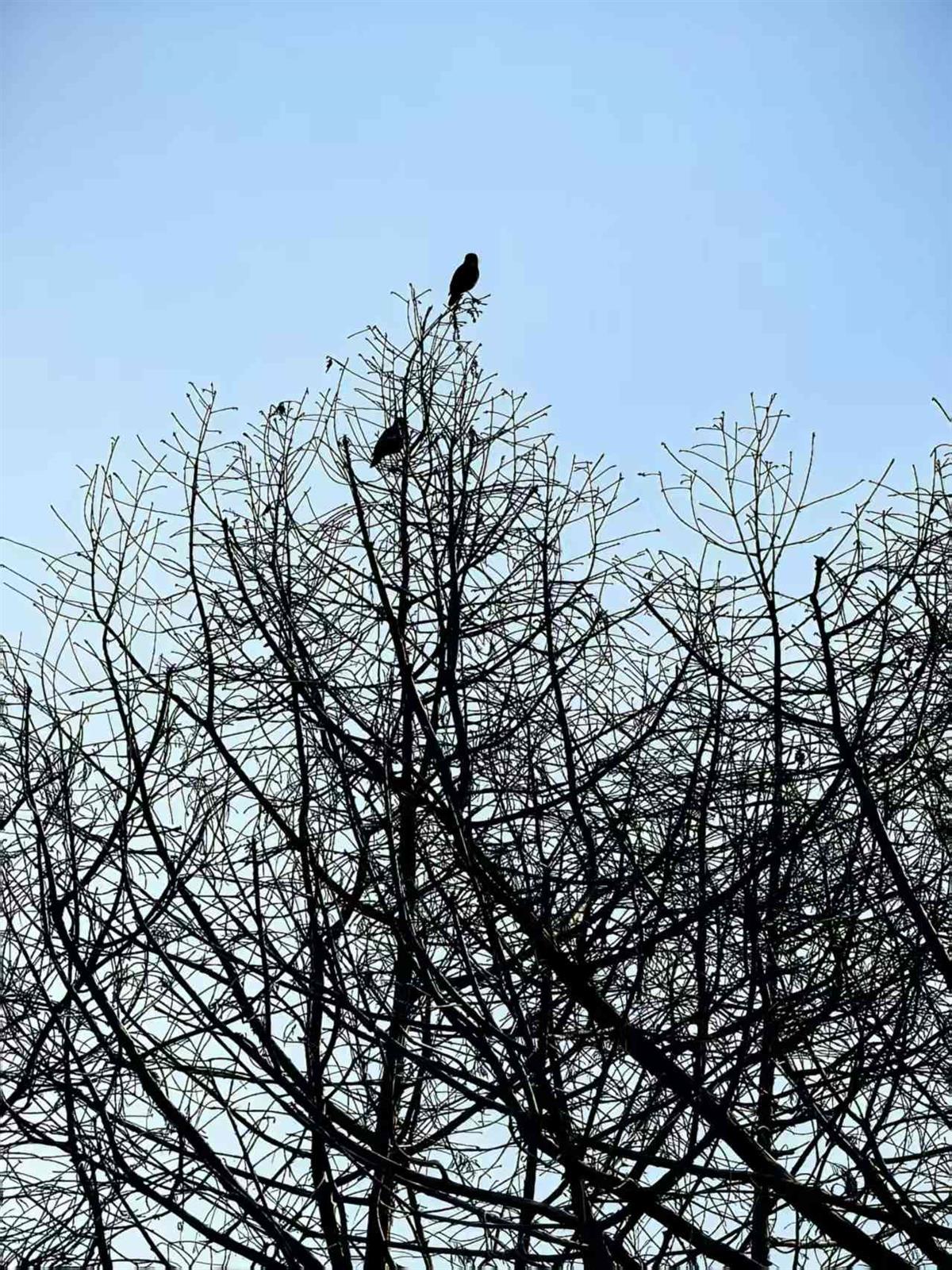 一树疏枝在晴空下舒展,如同被风揉碎的墨线,在澄澈的蓝幕上勾勒出错落的韵律。几只鸟儿静立枝头,仿佛自然以最简洁的笔触,勾勒出生命的剪影。