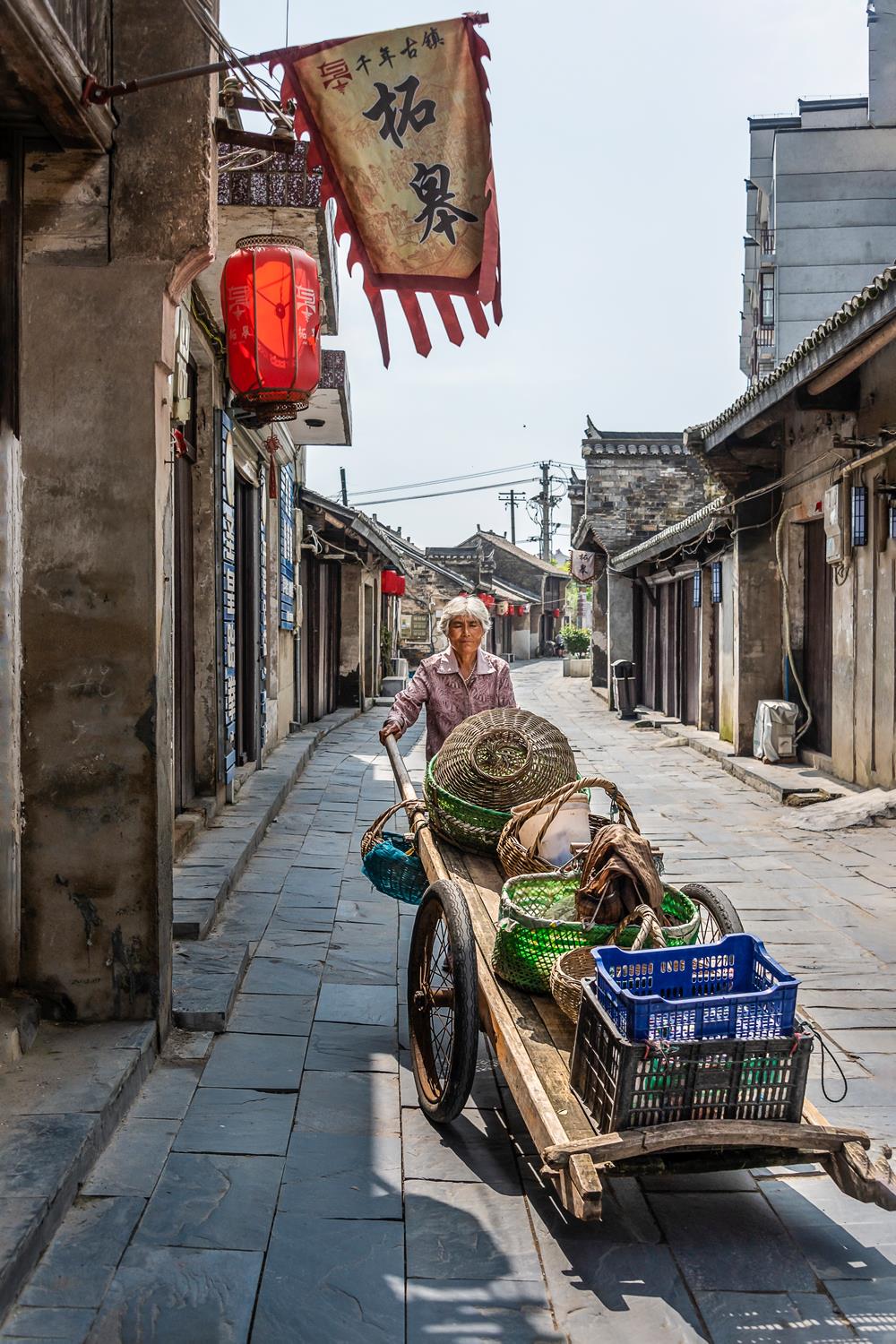 在巢湖柘皋古镇的老街上,晨光穿过明清古建,一位老人推着满载蔬果的小车,走在青石板路上。红灯笼与古旧的店招相映成趣,定格了这座千年古镇最鲜活的日常与烟火气。