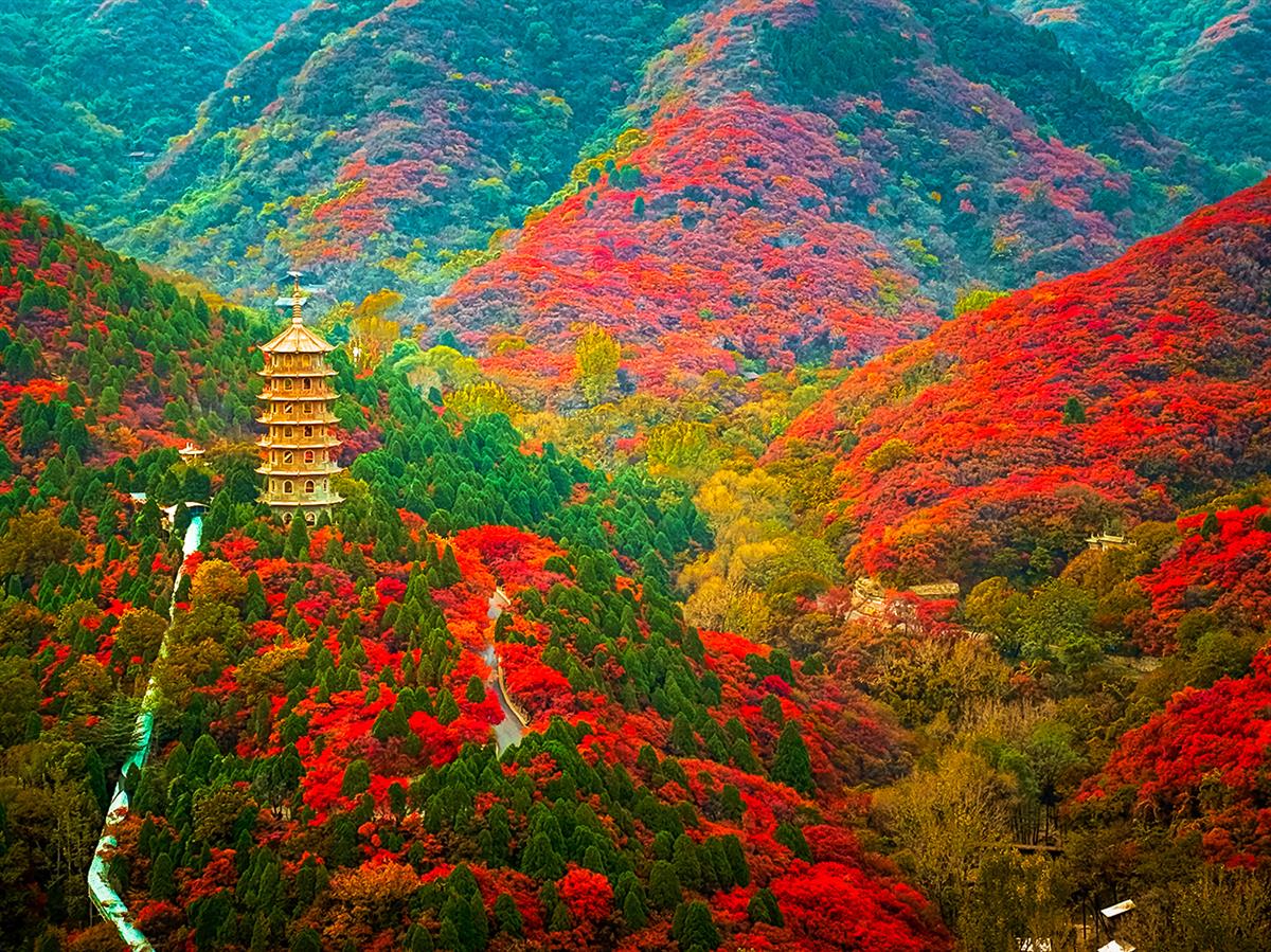 济南红叶谷的秋意浸满山谷,层林被霜色晕作炽红与金橙,簇簇翠柏嵌在斑斓里,古朴宝塔静立林间,蜿蜒步道穿林而过,浓艳色彩裹着古雅韵味,铺展成深秋独有的热烈画卷。