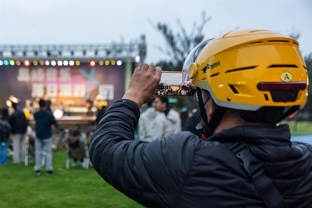 在河南郑州城市绿地音乐会的彩光漫开,黄盔骑手举手机对准舞台,镜头框住乐声里的人群与律动。奔波间隙的驻足,让工装与音浪相融,揉出烟火日常里的文艺温柔。