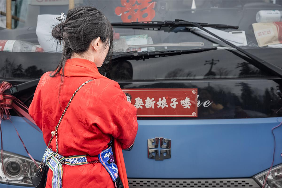 《娶新娘》红衣新娘子的银饰与彩绦在风中轻晃,婚车的 “囍” 字与 “娶新娘子喽” 的红牌相映,传统婚俗的热烈与现代迎亲的鲜活,在这一刻交织成画。