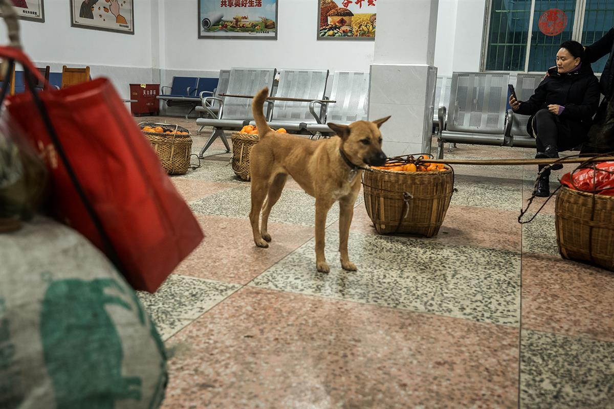 《候车》候车室的地面上,黄狗与满筐橙橘相伴,竹筐与红袋静立,行人在座椅上刷着手机,慢火车的候车时光里,是山乡赶集的鲜活日常。