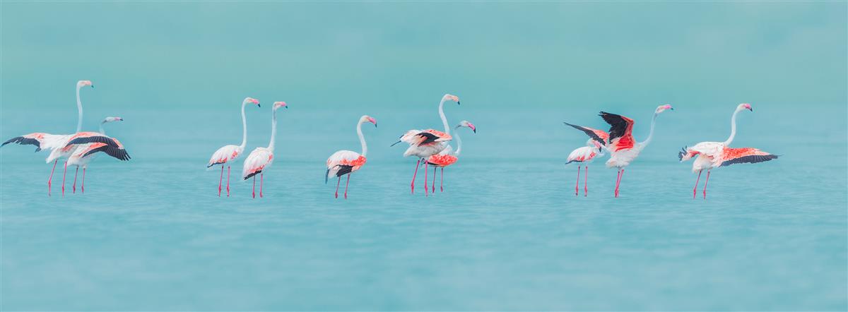 一群火烈鸟在澄澈的浅蓝水域中悠然伫立,部分舒展着粉白相间的羽翼。它们修长的腿轻踏水面,与朦胧的背景融为一体,宛如在青波之上翩跹起舞,尽显灵动与优雅。