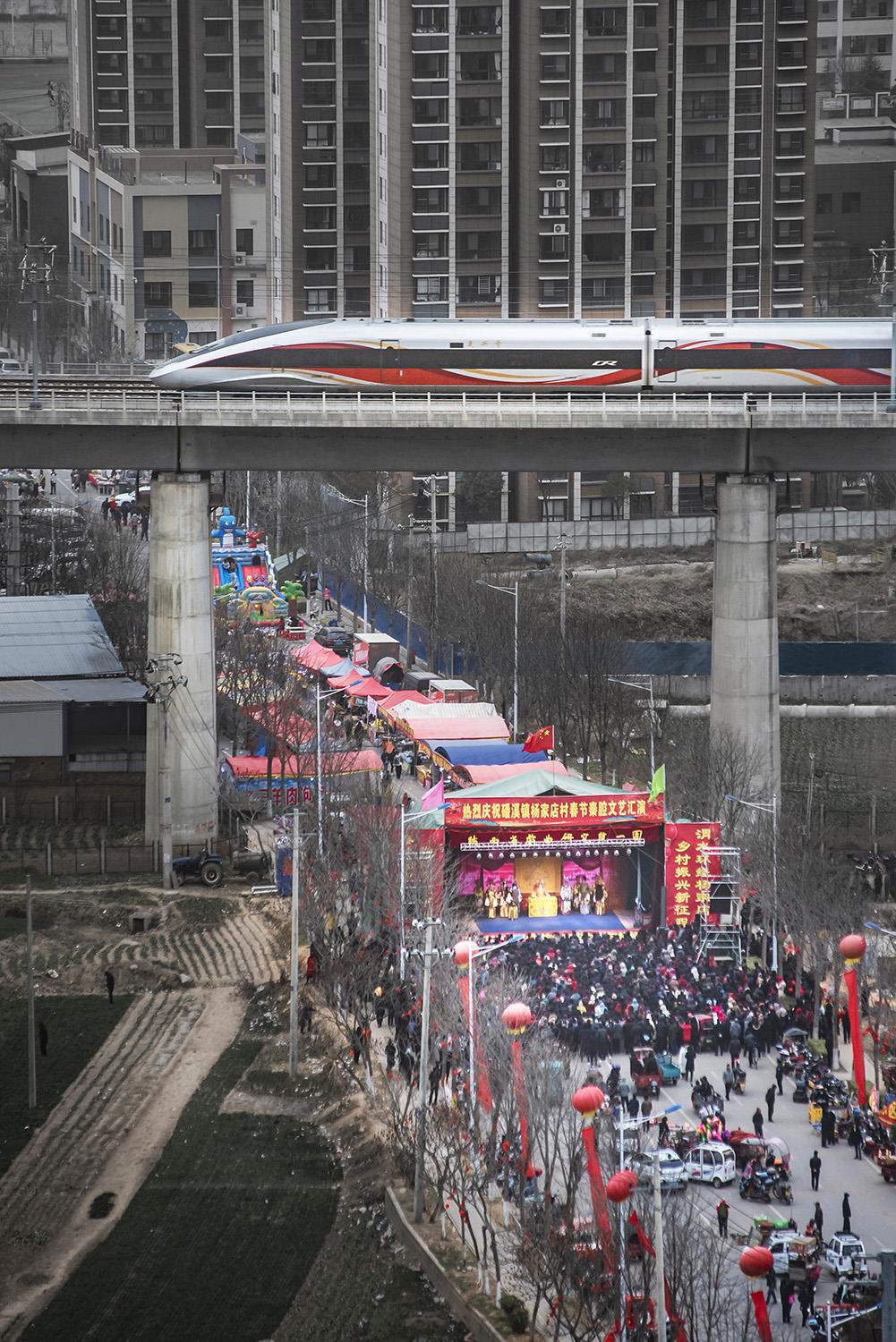 陕西宝鸡春节期间秦腔大舞台,高铁前来祝贺.