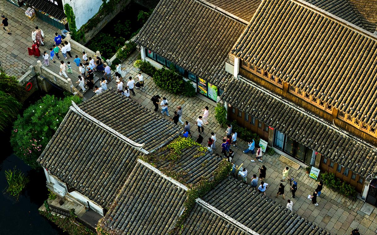 荡口古镇、水乡民居群落中,游人穿梭游赏,青瓦屋顶、石板巷与水系相映,尽显古镇旅游的人文与景观融合之美