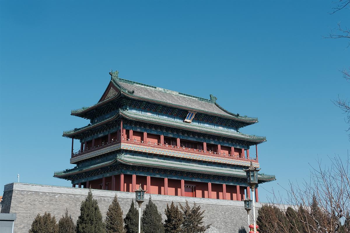 仰望高耸的城楼,精致的彩画与飞檐在澄净的天空下划出优美的弧线。枯木与常青树在下方交错,勾勒出老北京特有的季节韵味,这是古老建筑与现代节奏的一次静谧交汇。