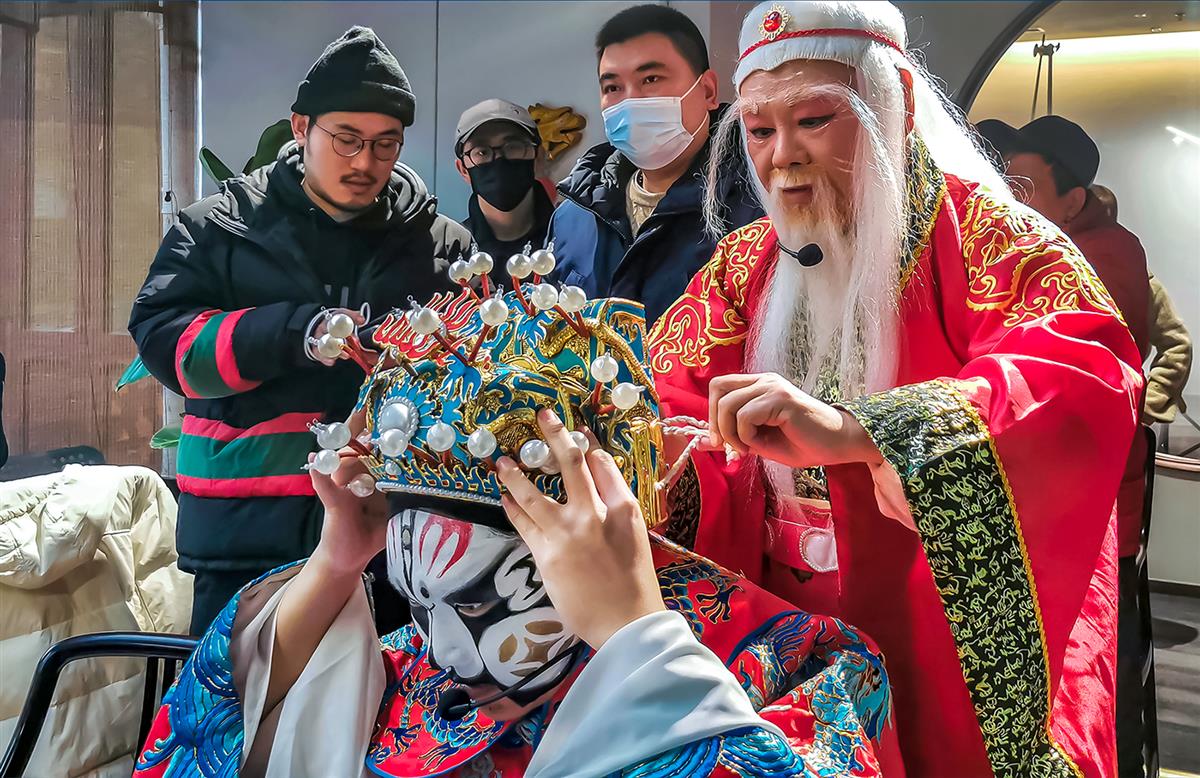 元宵佳节当天,一组老年戏曲爱好者在豫园中心广场华宝楼前饰演六仙祈福活动,演出前的化妆成为一景。