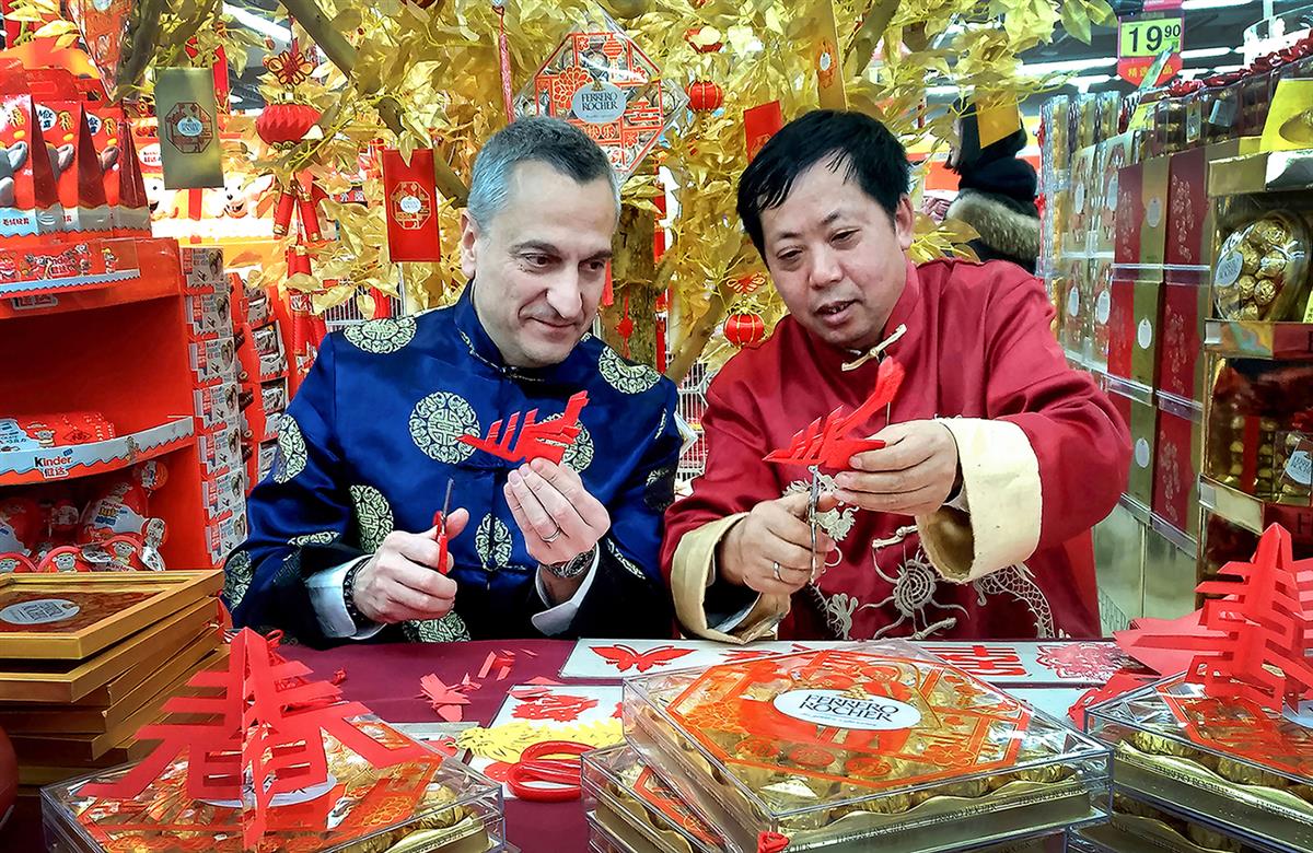 摄于上海长宁区西郊百联购物商城。一外国友人正向中国剪纸艺人学习中国剪纸。