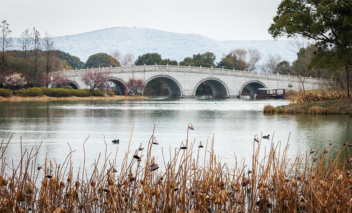 冬日的尚湖,褪去了夏日的喧嚣,却多了几分水墨的诗意。残荷在寒风中挺立,五孔石桥静卧湖面,远处的虞山覆着薄雪,宛如一幅天然的水墨画。水鸟划过水面,泛起圈圈涟漪,仿佛在诉说着江南的温柔与沉静。