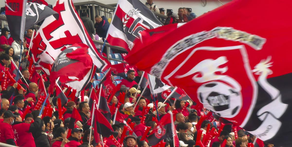重庆市“渝超”足球比赛现场,热情的观众为参加比赛的双方队员鼓劲加油。