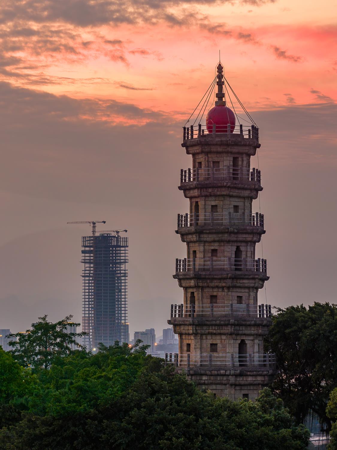古塔凝望着城市的过往,新楼拔地而起续写未来,古今建筑在晚霞中对话,勾勒出城建艺术的传承与新