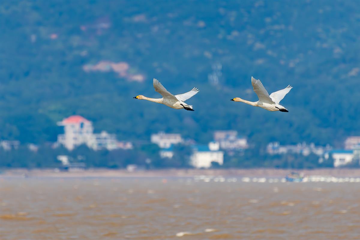 双鹅逐风而舞,白羽流光,在滩涂与城郭间,诉说着生态系统的鲜活韵律。