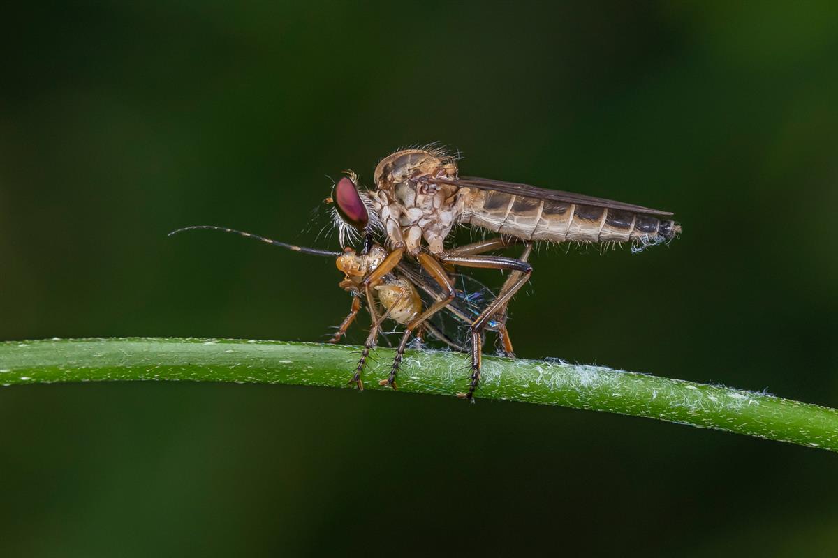 食虫虻静栖绿茎,衔住猎物,在微观世界里,定格生态链中一环的鲜活瞬间。