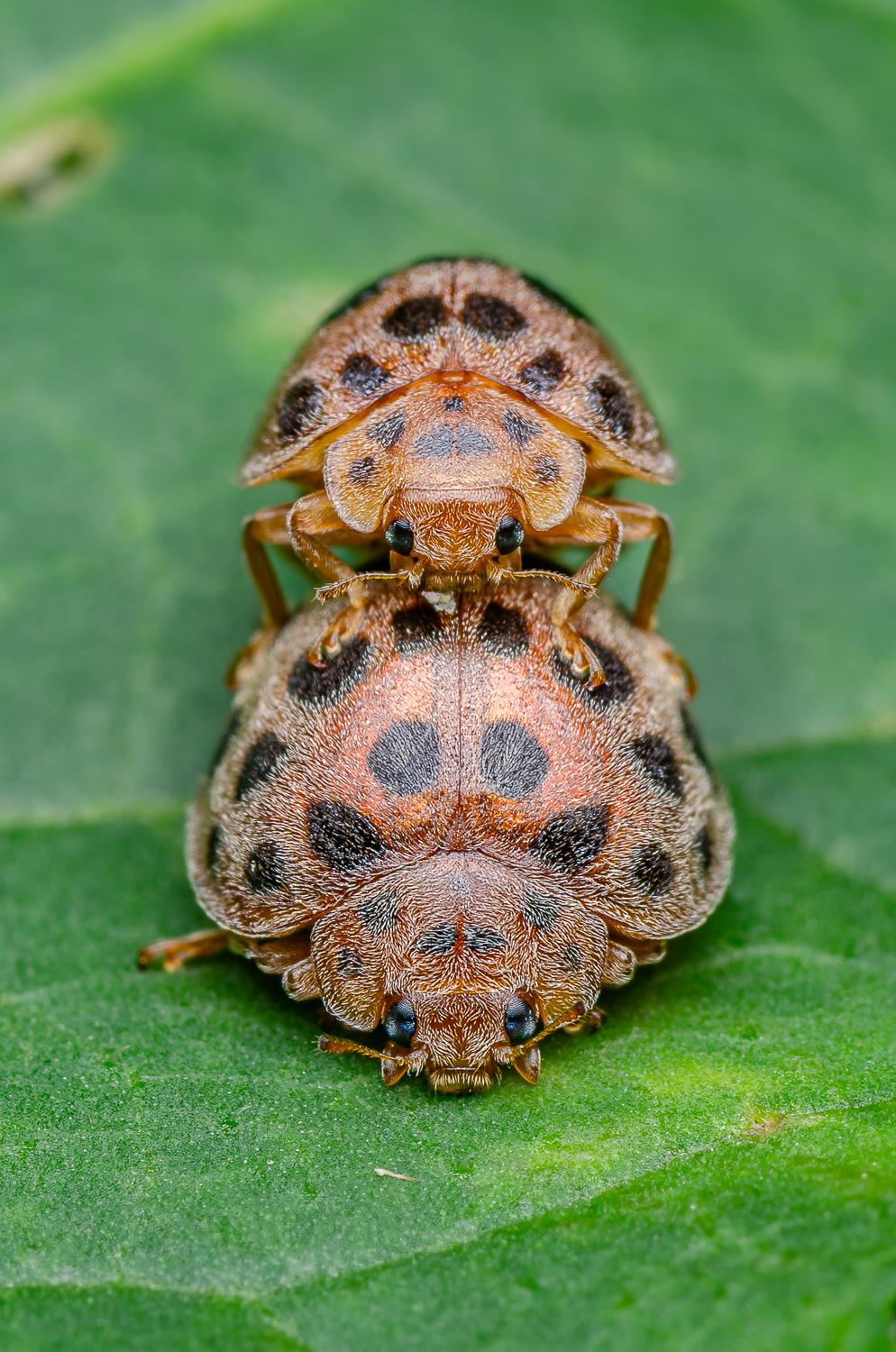 两只瓢虫叠栖于翠叶之上,在微观世界里,定格生态画卷中生命繁衍的温柔瞬间。