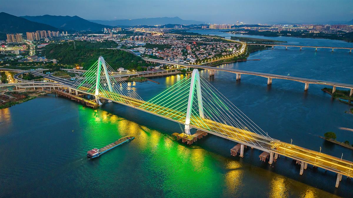 斜拉桥以绿索为弦,在江面上奏响城建与自然交融的艺术乐章。