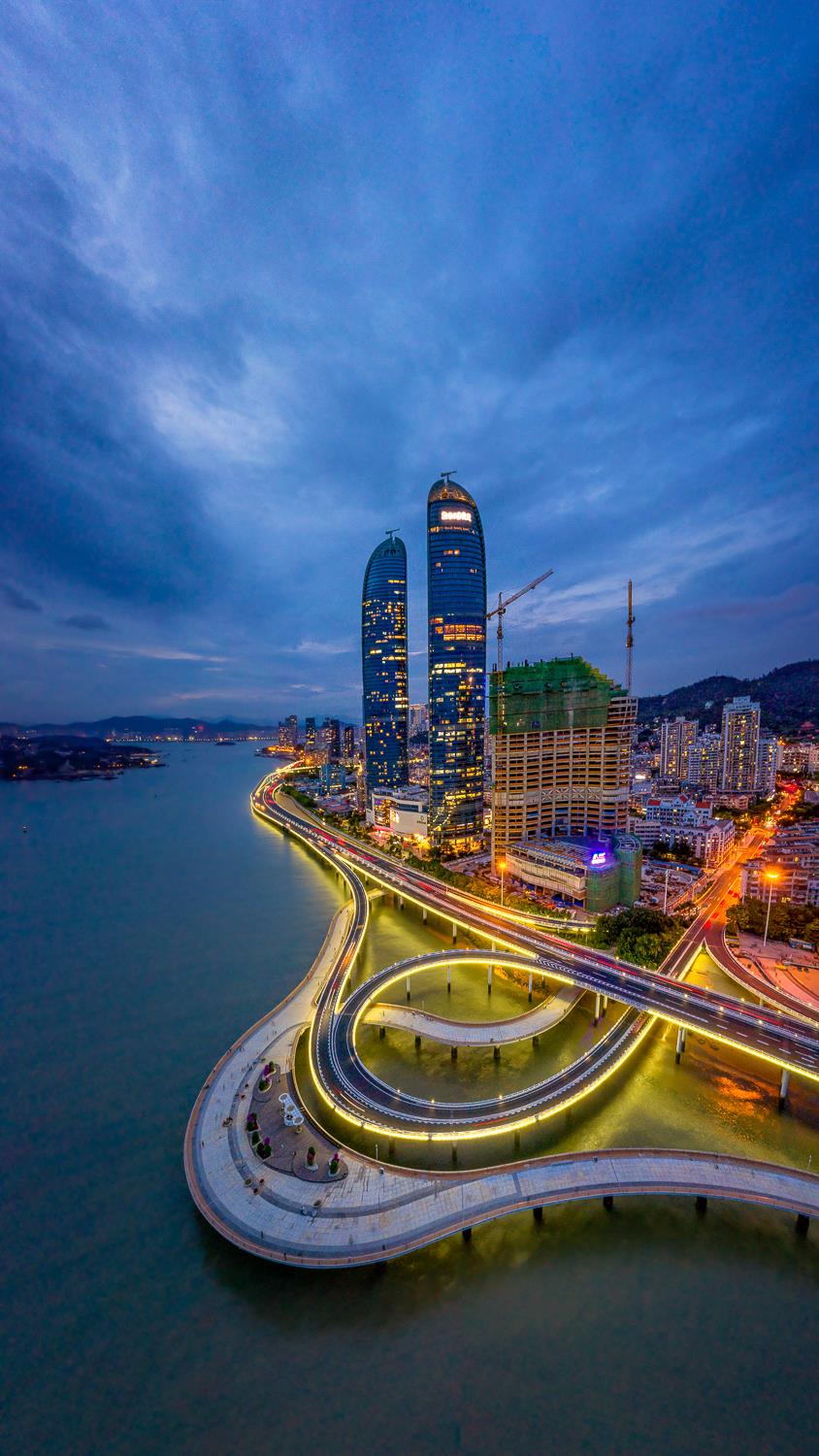 厦门双子塔如双帆竞发,环岛路如金带蜿蜒,在暮色中勾勒出滨海城建的艺术张力。