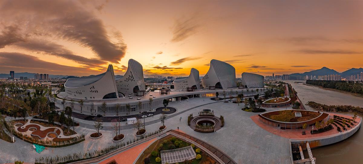 海峡艺术中心如白帆竞发,在江湾与晚霞间,勾勒出兼具未来感与艺术张力的城市新地标。
