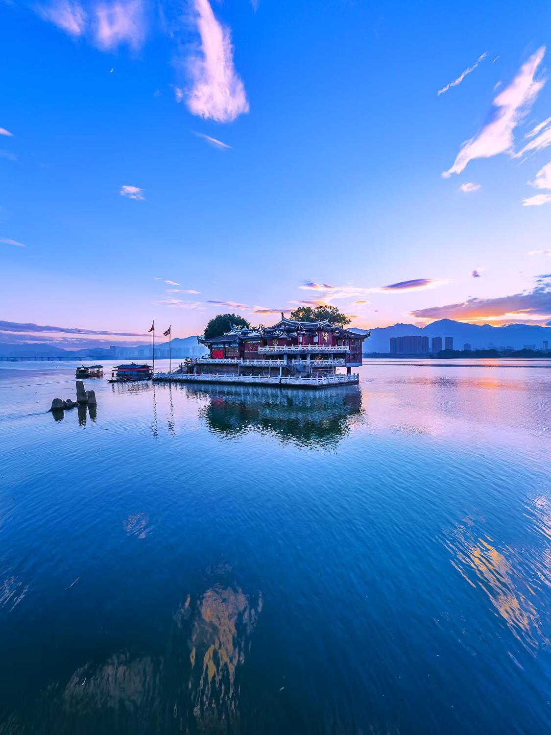 飞檐翘角倒映江面,在蓝调天色里,展现出传统建筑的空间美学与人文温度。