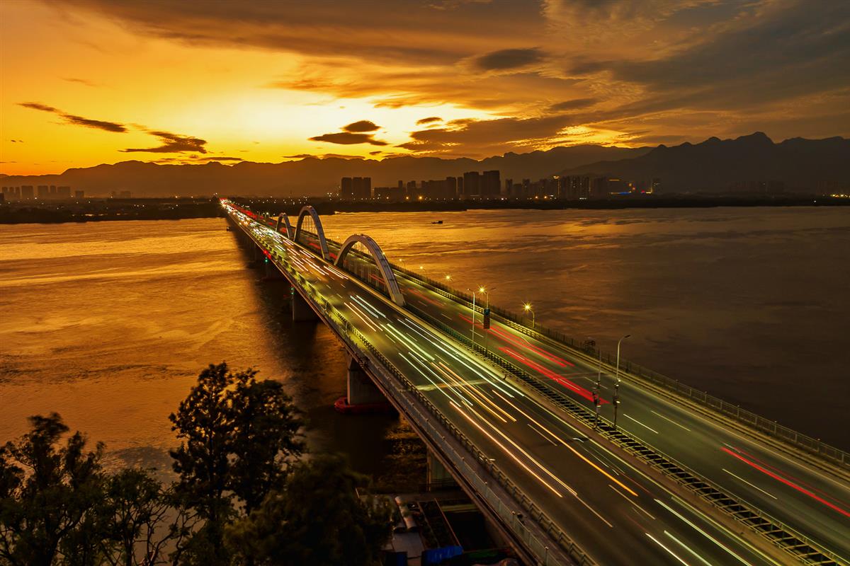 拱桥如长虹卧于鎏金江面,车灯轨迹如丝,在晚霞中绘就一幅 “桥与城” 的城建艺术长卷。