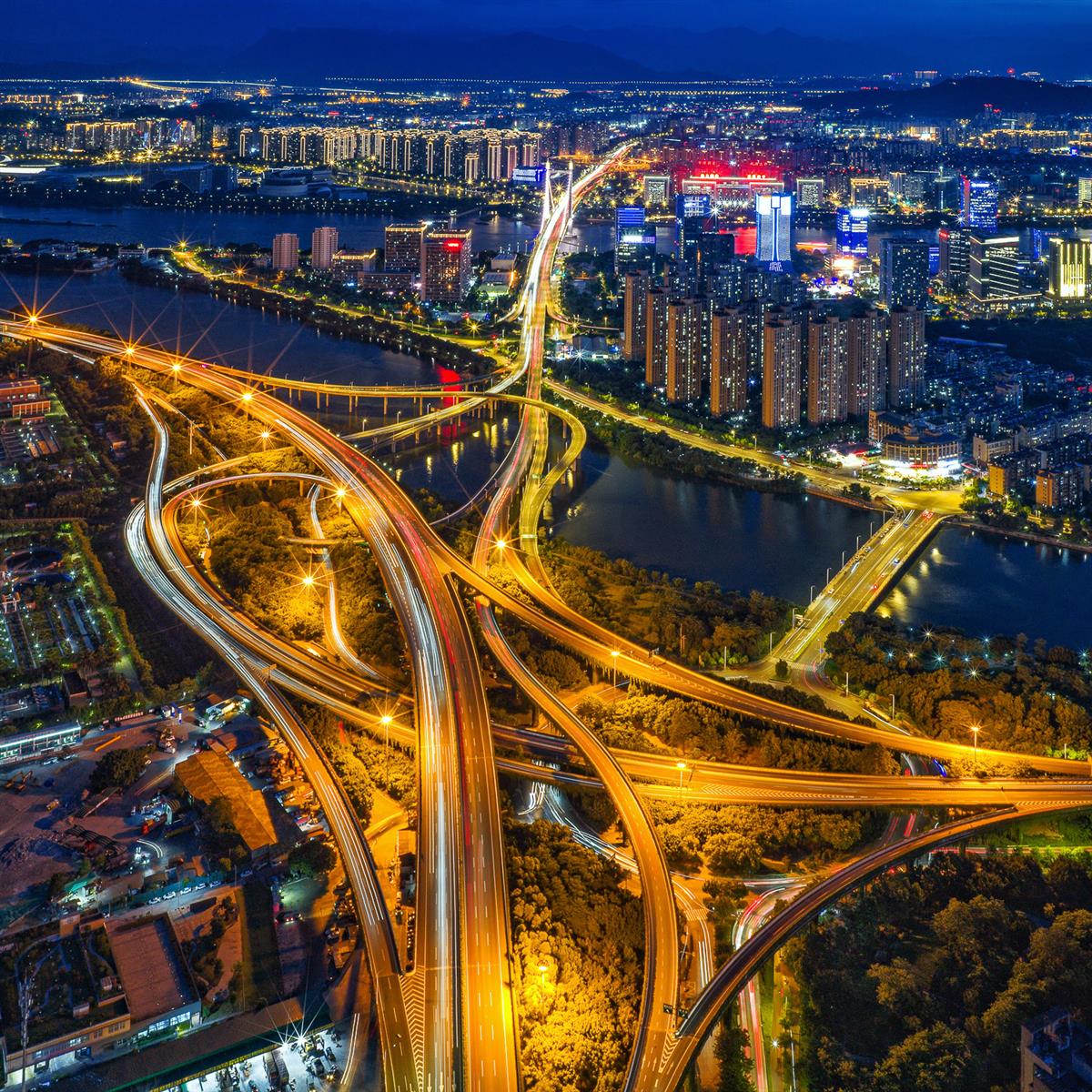 立交光轨如丝如带,江湾如镜,绘就一幅兼具科技感与生命力的城市艺术长卷。