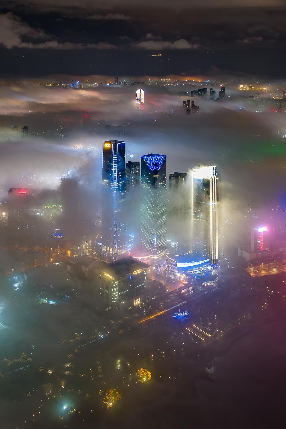 以夜空为幕,以光为笔,在平流雾的底色上书写出大气磅礴的现代城建艺术诗行。