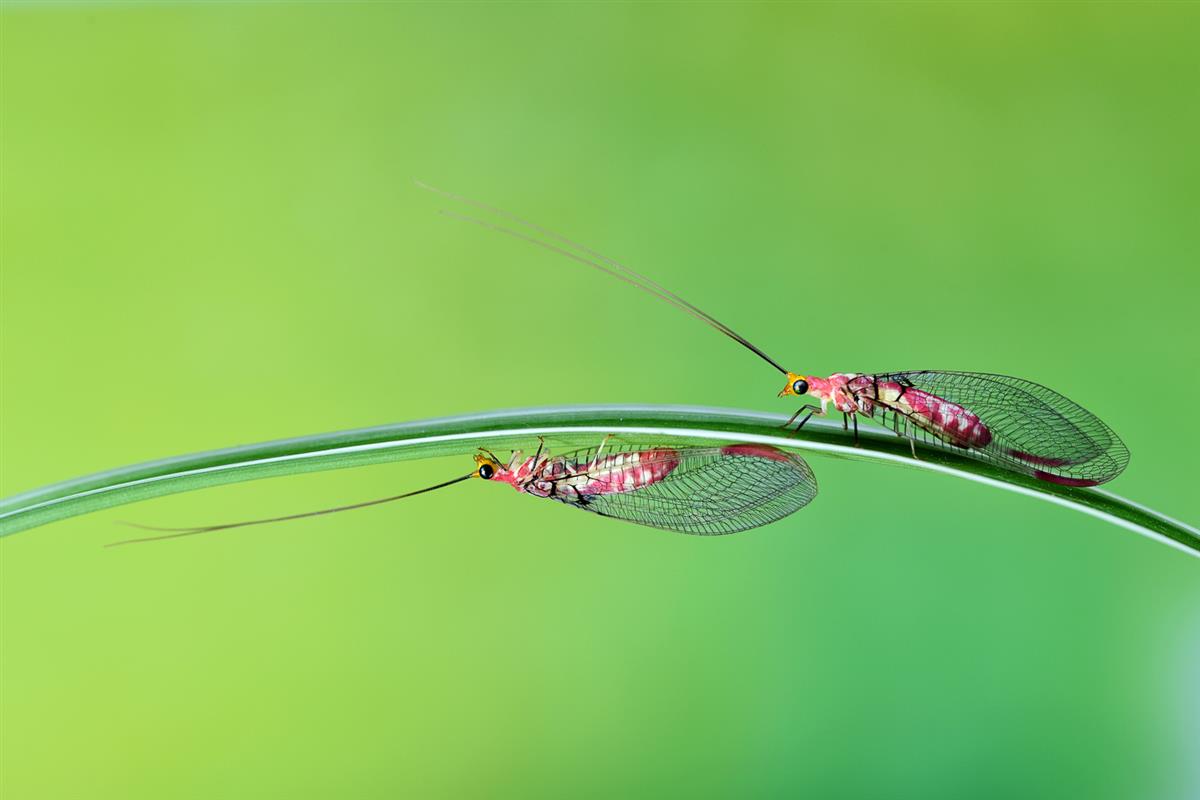 粉红外翅与翠绿草叶在镜头下流光溢彩,绘就一幅微观世界与自然生态交融的艺术长卷。