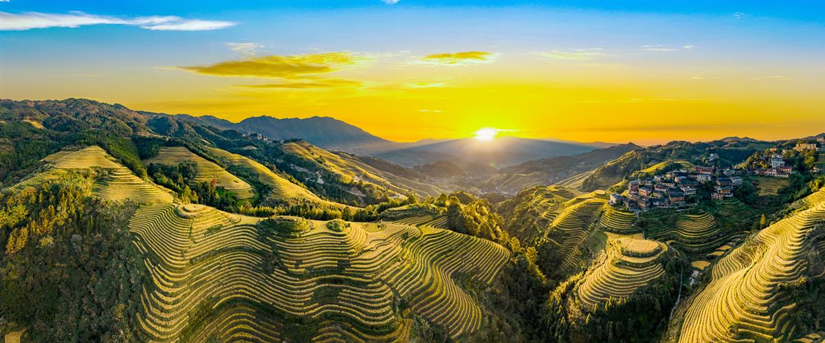 梯田在晨光下熠熠生辉,与山林肌理相映成趣,绽放出山地生态的独特魅力。