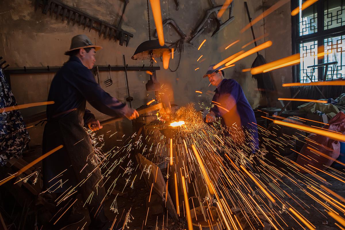 铁匠师傅将烧软烧红的铁块反复捶打,锤炼出各种形状。在捶打过程中火星溅出的线条,也是生活中自然存在的优美画面。