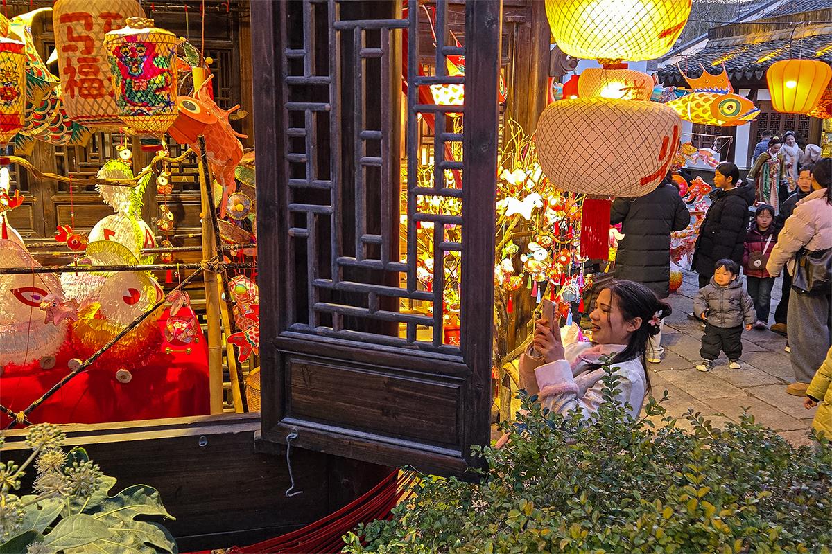 古镇上一间充满节日氛围的小店,吸引了游客前来购物与打卡。