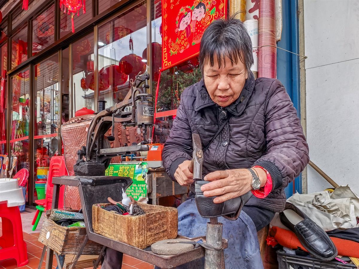 阿婆专注地敲打着鞋履,老工具与红笼相映,在街头巷尾勾勒出最踏实的人间烟火。