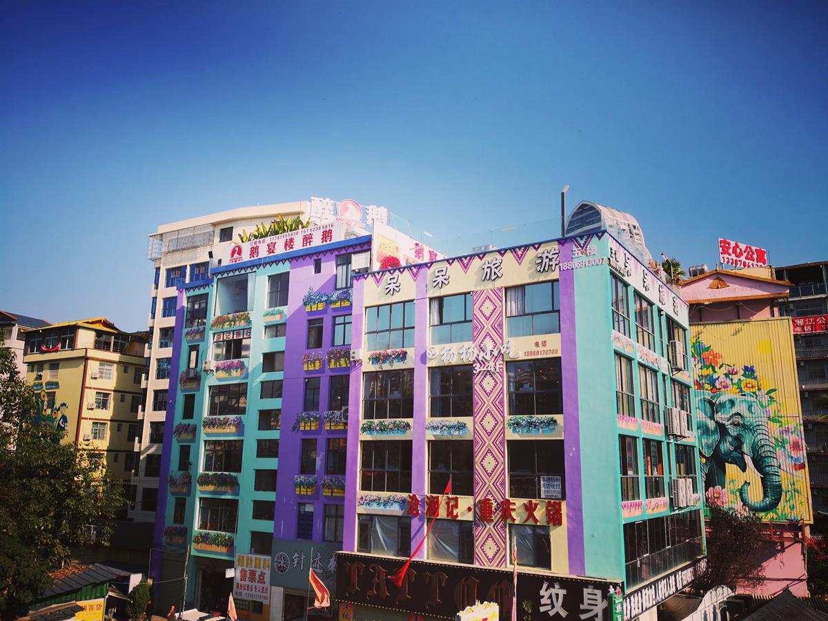 西双版纳景洪市的一栋极具特色的彩色商业楼,是当地网红打卡点之一。整栋楼以大面积的薄荷绿、淡紫色和米黄色为主色调,搭配傣族风格的几何纹样和立体花箱彩绘,在蓝天绿树的映衬下格外醒目,充满了热带风情与艺术感。集旅游服务与市井生活于一体的复合空间。建筑旁的热带植物、清晰的招牌文字,以及充满生活气息的商铺,展现出西双版纳“旅游+烟火气”的独特城市气质。整体风格活泼、治愈,也能让人直观感受到西双版纳“多彩、包容、充满活力”的城市性格。