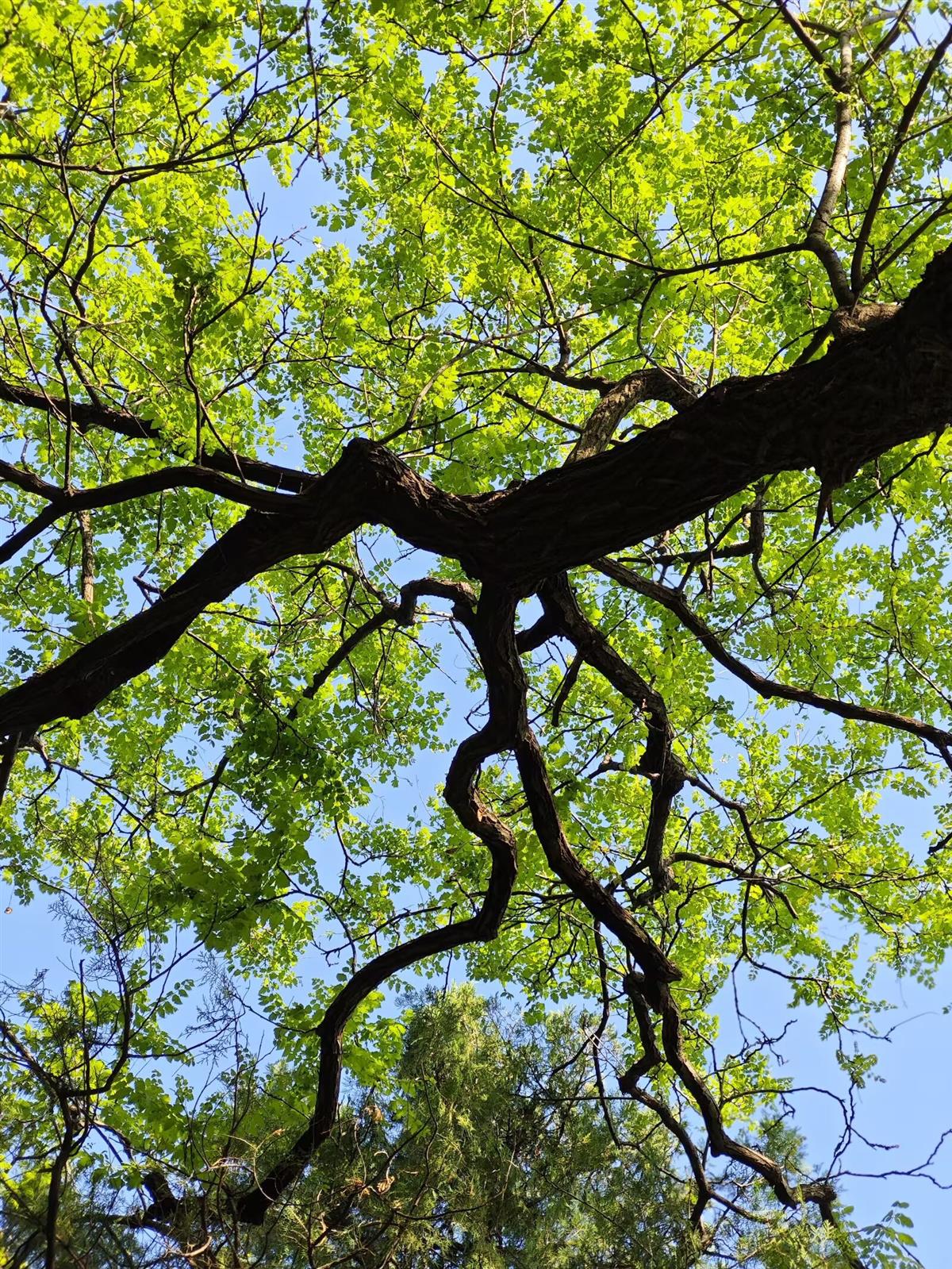 仰拍的大树,繁茂的枝叶像一团蓬松的云,和蓝天的搭配又特别清新有生命力。