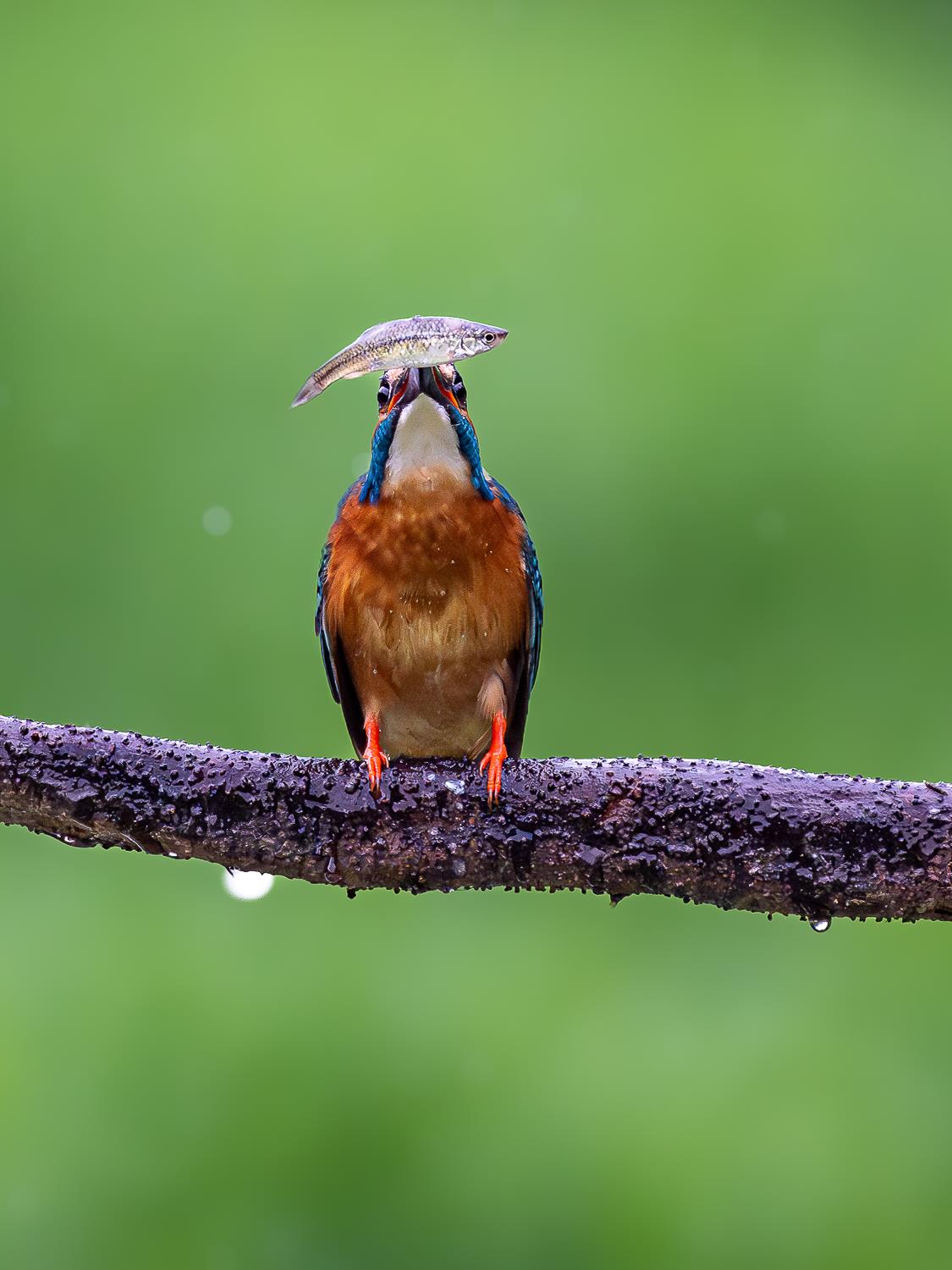 翠鸟静栖湿枝,口中衔着刚捕获的小鱼,蓝橙羽色在绿意中格外醒目,这是湿地生态最本真的捕食瞬间。