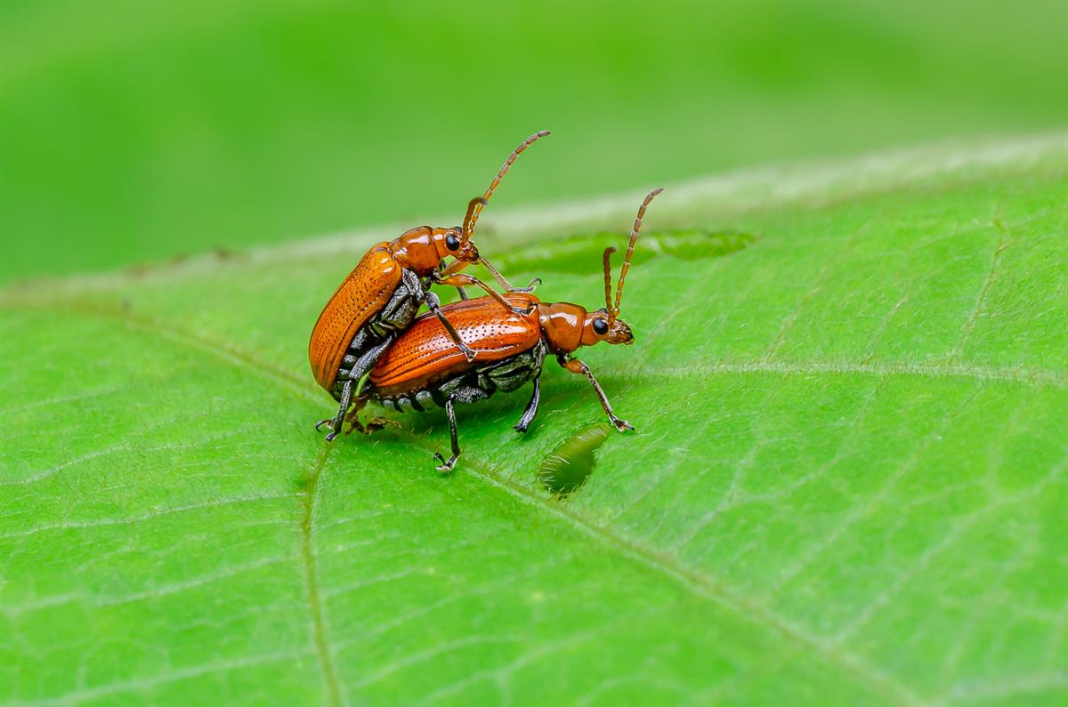 两只橙甲虫在绿叶上交尾,橙红的鞘翅与翠绿的叶片相映,这是微观生态里最本真的生命延续瞬间。