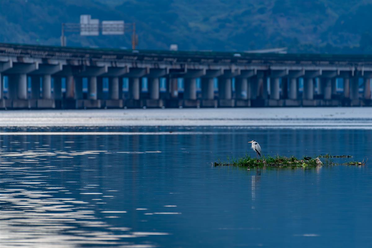 苍鹭静立于江心草洲,身后是现代大桥与青山,蓝波荡漾间,勾勒出一幅城市与自然和谐共生的生态图景。